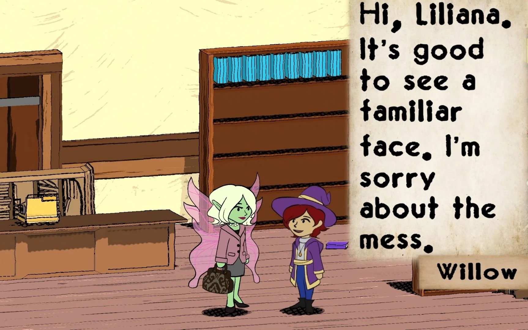 Dialogue with Liliana. Notice the unique placement of the text. Most games put this at the bottom third of the screen, but our choice is reminiscent of a storybook having the text intertwined or next to the illustration